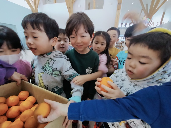 当園からは雪国でしか触れられない「雪」を送り、エンゼル幼稚園からは地元の名産「みかん」をいただきました!