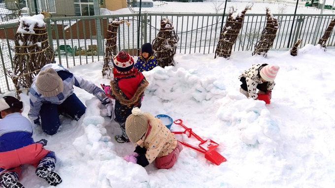 雪の塊を積み上げて、雪のお家を作りました。友達と会話を通してイメージを共有し、協力して素敵なお家が完成しましたよ!「おにがきてもだいじょうぶだね!」と節分への対策もばっちりです☆ (2歳児 さくら組)