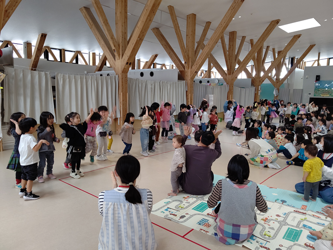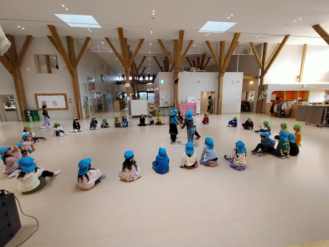 年長さんが卒園するので、お別れ会を行いました。運動会で踊った「どうぶつでんしゃがやってきた」の踊りをプレゼントしましたよ♪