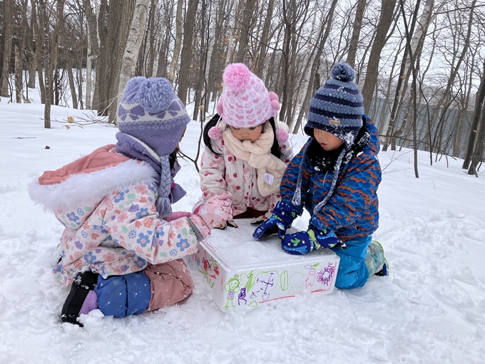 当園からは雪国でしか触れられない「雪」を送り、エンゼル幼稚園からは地元の名産「みかん」をいただきました!