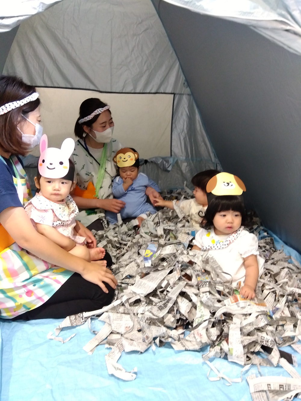 縁日を楽しみました! 新聞プールに入ってお祭りの雰囲気を味わっていた『すずらん組』の子どもたちでしたよ♪