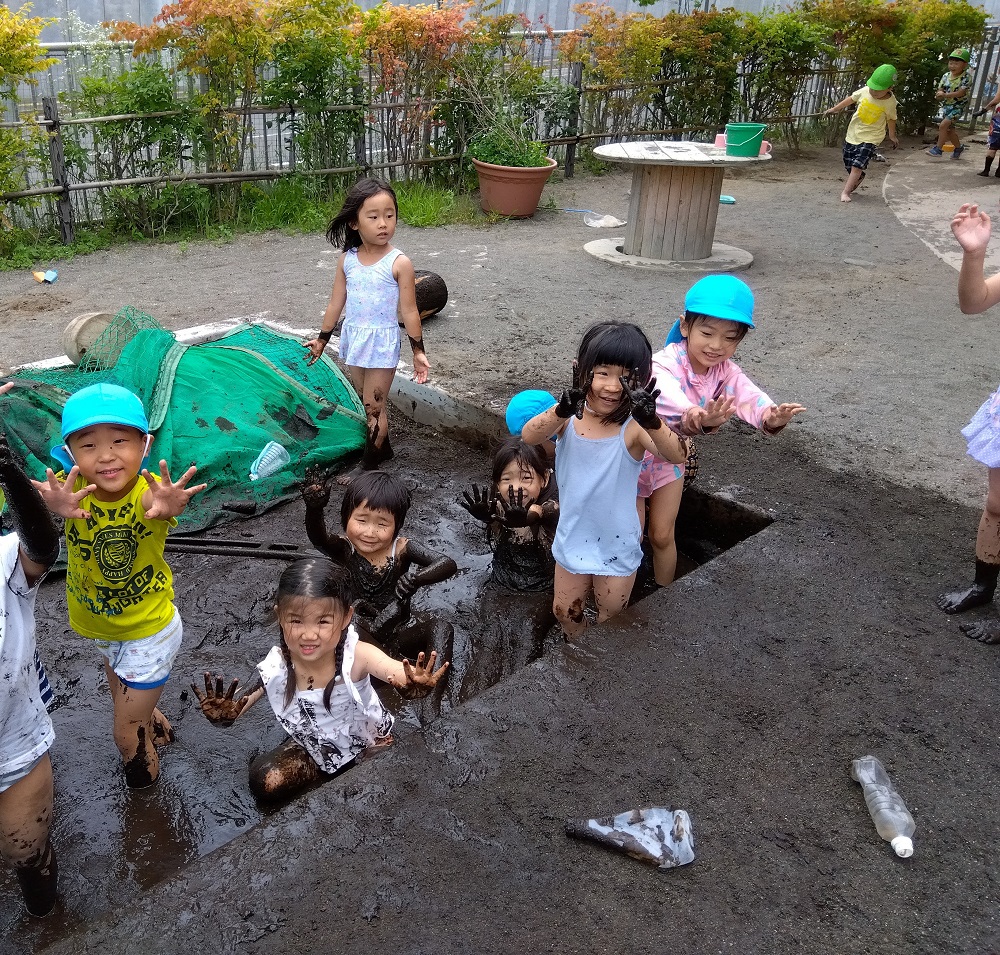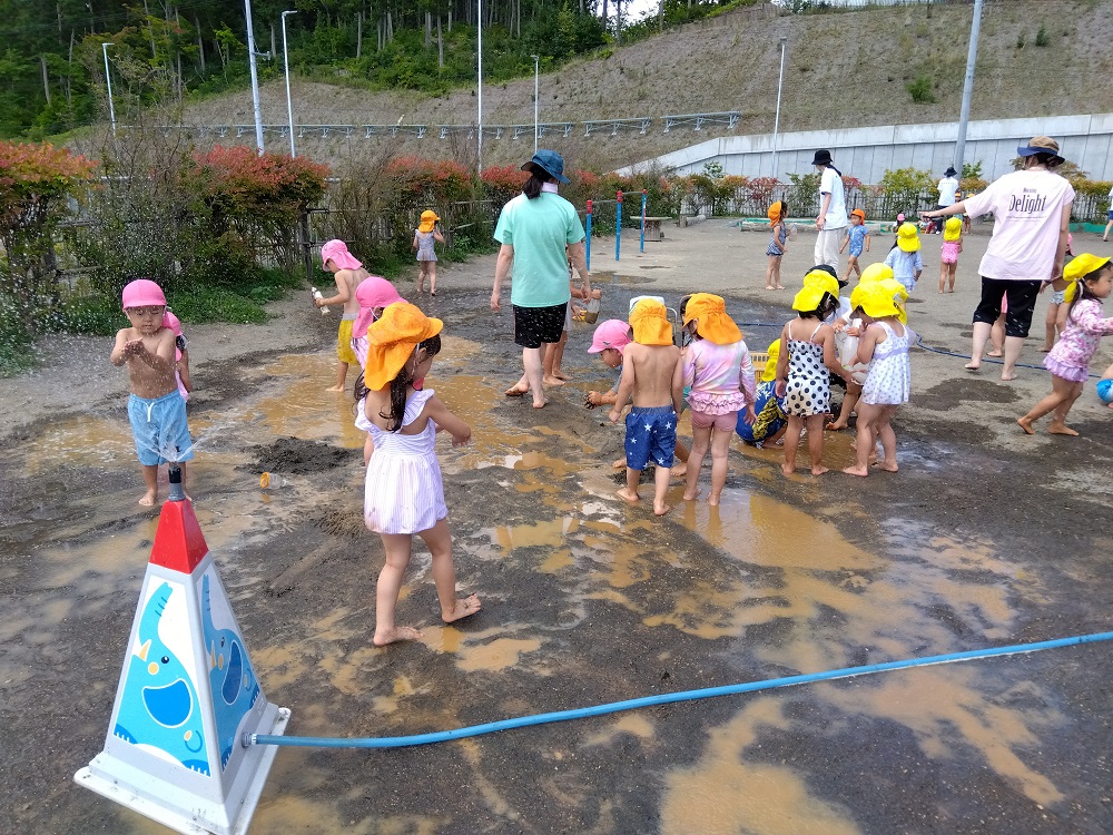 みんなで園庭で水遊び!冷たくて気持ちいいね☆