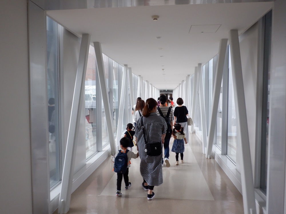 園から大学に続く連絡橋を渡り、大学施設へ・・