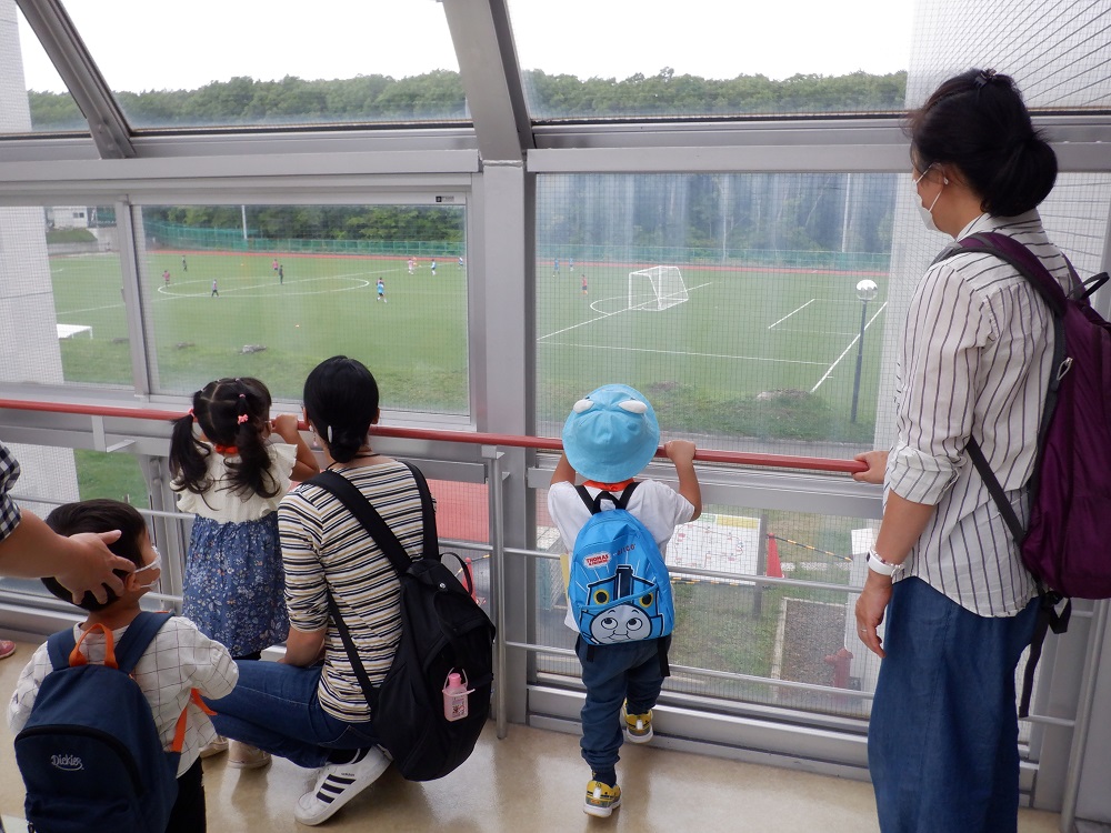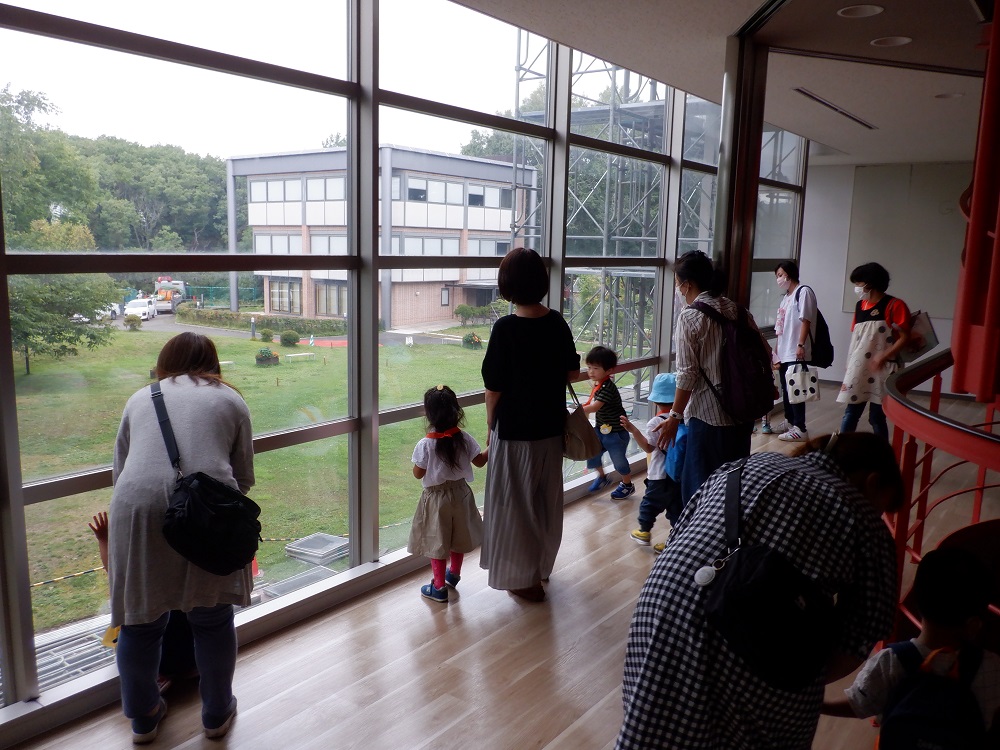 体育館を通過し次の施設へ到着。窓から見えるのは、大学のガーデンです。本園の幼児も乳児もよくここに来てお散歩をします。