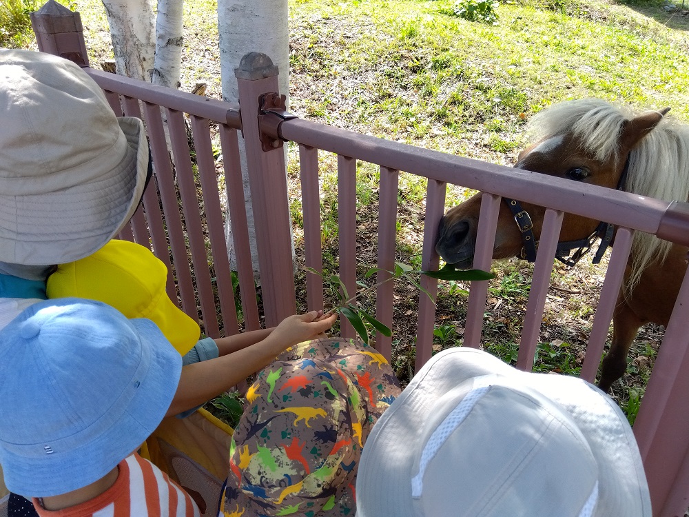 大きな口でご飯をむしゃむしゃ食べているお馬さんに興味津々な子どもたち!