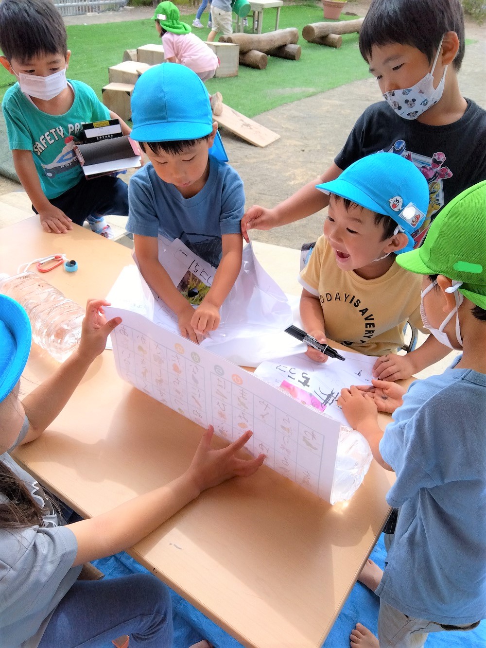 皆で見つけた虫の写真を使ってオリジナル図鑑を作っているよ! ひらがな表を見ながら、虫の名前を書くことにも挑戦!