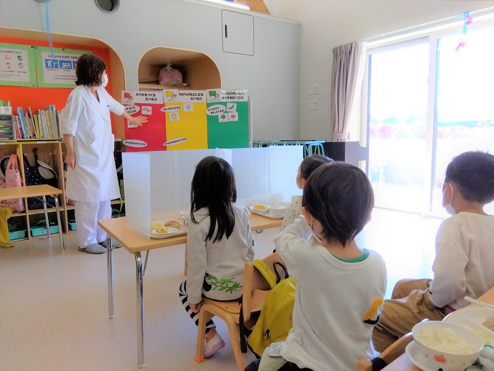 栄養士さんに食べ物の働きについて教えてもらいましたよ! その日から毎日の給食を見ながら食べ物の働きを確認しています!