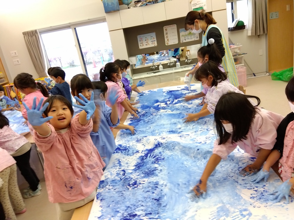 手を使ってダイナミックに絵の具遊びをしました! 感触や色の混ざり具合を楽しみましたよ♪