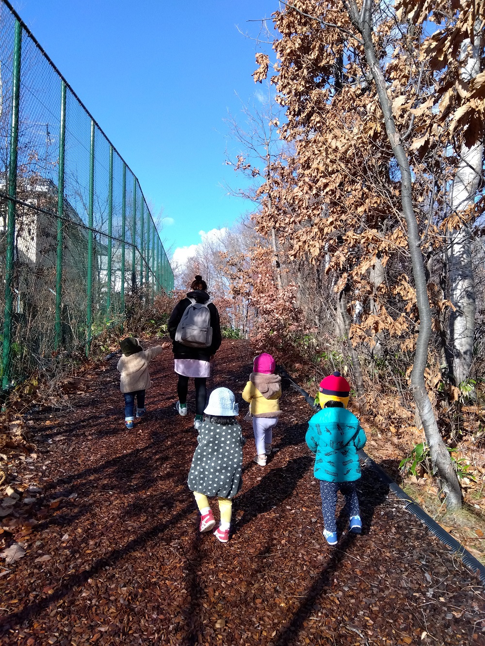 大学の森へ探索。 長い距離を歩けるようになった子どもたちは どんぐりや落ち葉を見つけながら楽しく探索していました♪