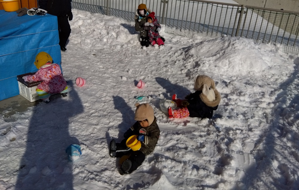 降り積もった雪に興味深々な様子の子どもたち! 道具を使ったり、手の平で雪の冷たさに触れたり、思い思いに 雪遊びを楽しんでいます♪