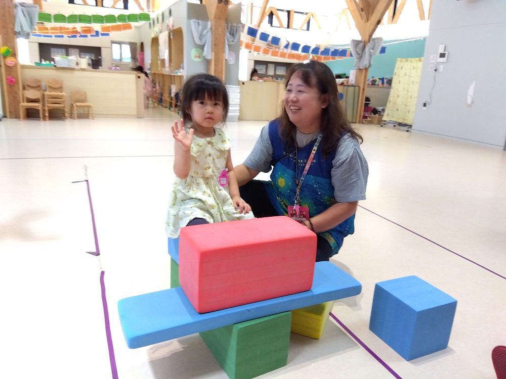 この後は、ホールで遊びました!カラー積み木を重ねて、乗り物を作ったりして楽しかったですね。