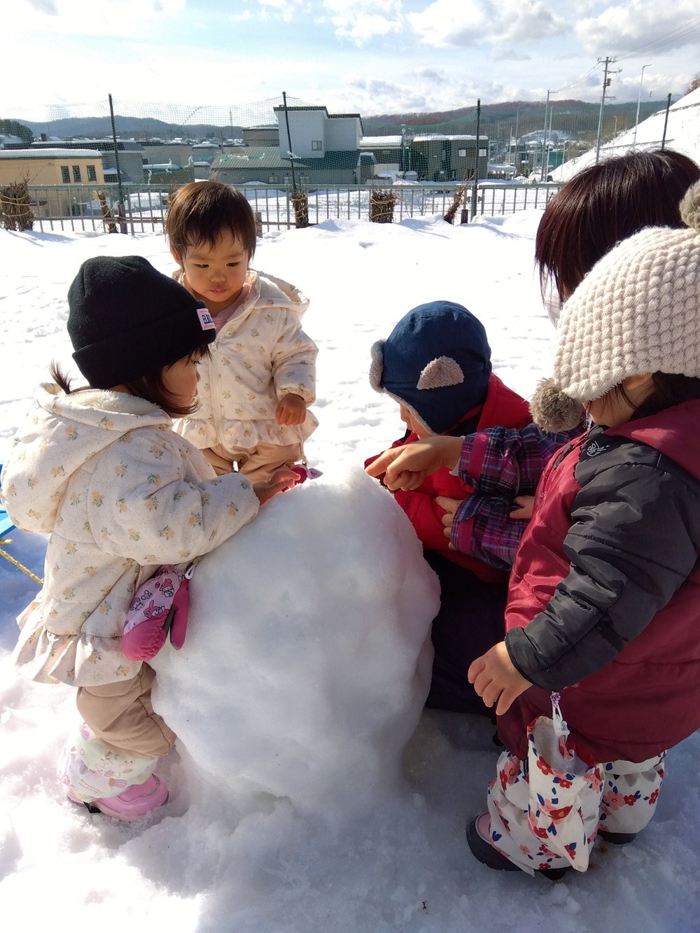暖かい日差しの中、園庭に雪の塊を発見して「チョンチョン」と言いながら指で穴を開けてみました。 雪のシャリシャリやツルツルの感触は、どう感じたのでしょうね。