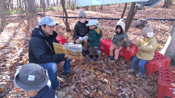 「もりのおふろ」という絵本を持ってコクサイの森へ! 落ち葉を集めてみんなでおふろに入りましたよ。