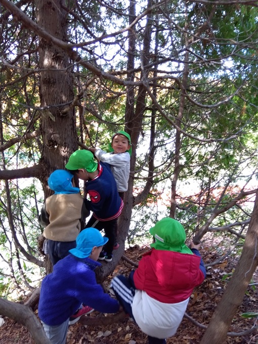 大学のガーデンに行って遊びました。 木の実探しや木登りを楽しんでいましたよ♪