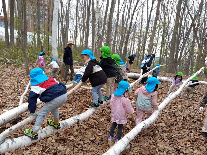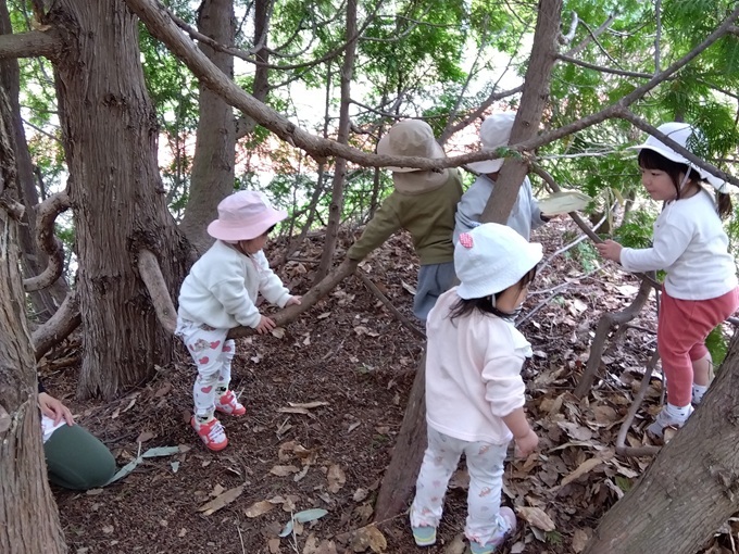 大学の森で遊びました。揺れる木で上手にバランスを取ったり虫探しや木登りに挑戦したりして楽しみました。