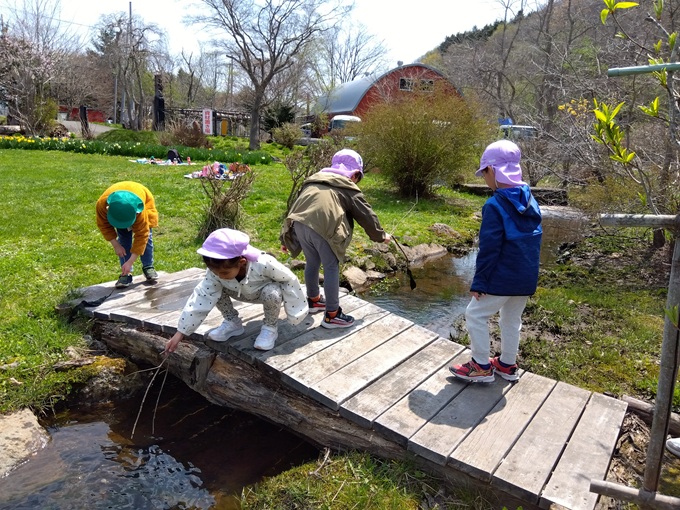 庭園の森で遊びました。川を覗いて「おたまじゃくしいるかな?」「あめんぼかわいい!」と夢中になって遊んでいましたよ。