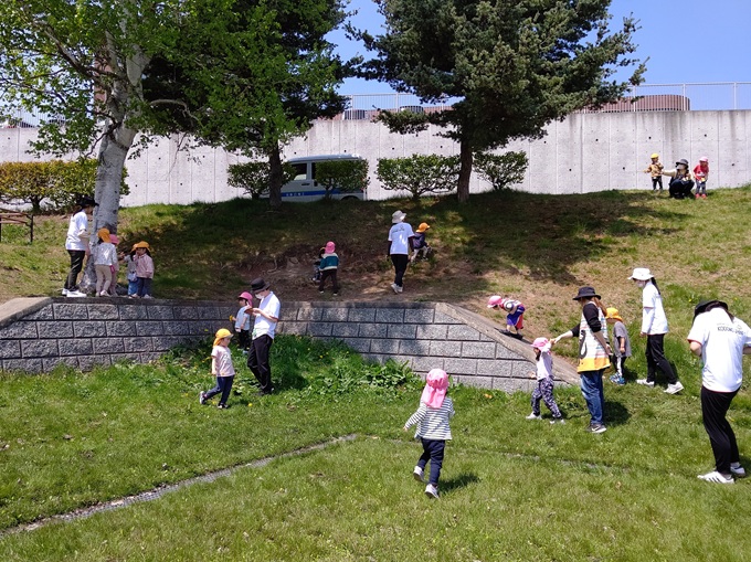 大学のお姉さん先生やお兄さん先生と一緒に清田中央公園へ遊びに行きました。山の上に登ったり、花摘みや虫探しをしたりとみんなで一緒に遊びを楽しみました。