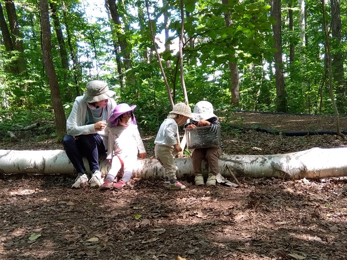 コクサイの森に入ると、暑さも少しやわらぎ心地良く過ごせます。保育教諭や友達と一緒にゆっくりしたり、虫を見つけたり、少し挑戦的な遊びをしたりと思い思いに過ごしています。(1歳児 たんぽぽ組)