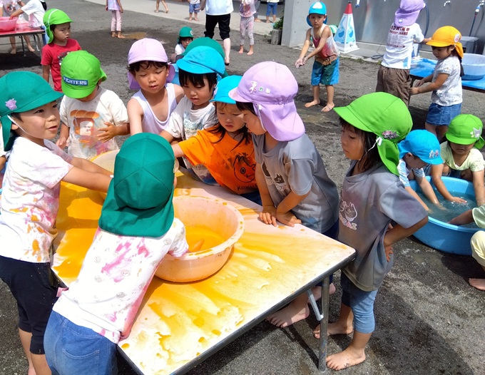 色の混ざり方や模様の広がりに興味津々!ボディペインティングを楽しみましたよ♪