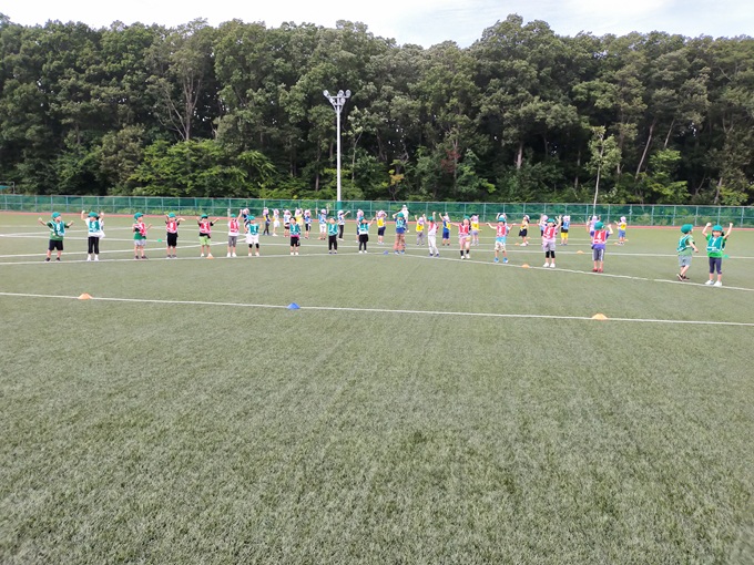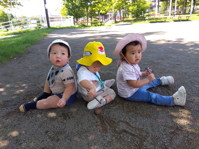 清田中央公園のグラウンドで歩行をしたり、砂でお絵描きをしたりして楽しみました。すると、自然とお友達が近くに来て1列に並びましたよ。いつも仲良しのすずらん組です。(0歳児 すずらん組)