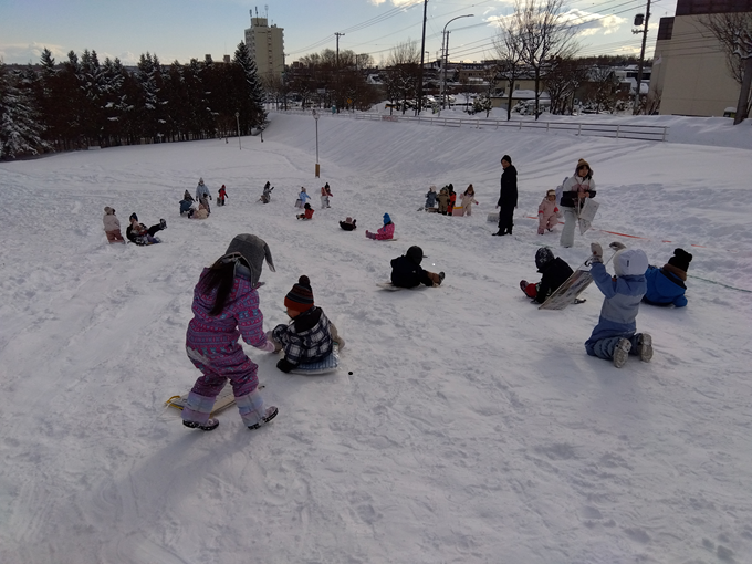 みんなで吉田川公園へ行ってきました♪初めての米ぞりでしたが、部屋で練習をしてきたので、バランスを取りながら上手に滑っていましたよ☆