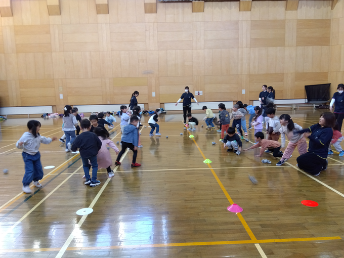 大学のお姉さん先生たちと一緒に運動遊びを楽しみました。新聞紙のボール投げやリレー等、たくさん体を動かして、みんなぽかぽかになりました!