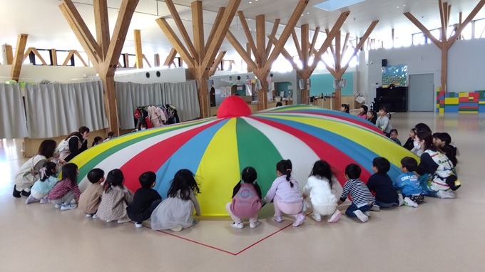 みんなでバルーンをしました☆全員で力を合わせて、バルーンを揺らしたり、上下に動かしたり、中に入ってみたりと楽しみましたよ♪