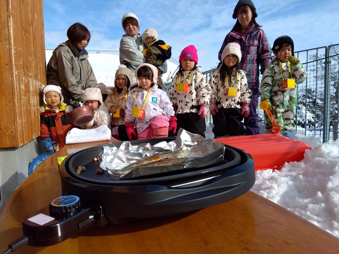 節分の日、園庭でイワシを焼いたり豆を煎ったりしました。鬼が嫌いなイワシの匂いを実際に嗅いだり、本物の大豆を見たりと節分という行事を五感を通して知る機会となりましたよ!
