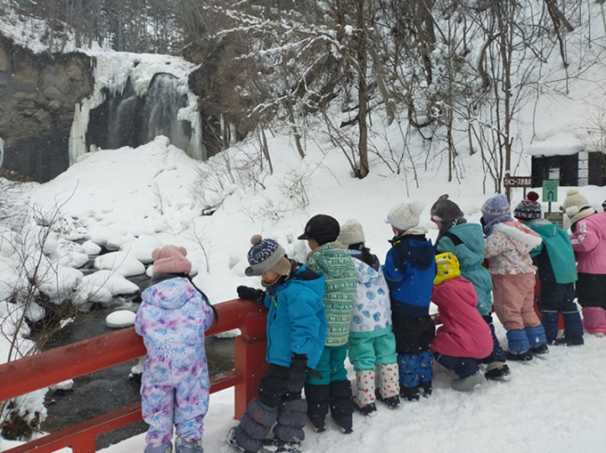 遠足で滝野すずらん公園へ行き、“アシリベツの滝”を目指して散策を楽しみました!凍った滝を見つけ、大喜びの子どもたちでした☆
