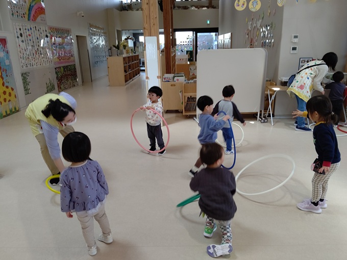 こども園での生活に少しずつ慣れ、毎日元気に遊んでいる姿がありますよ。友達と一緒に「せーの」でフラフープを回し、どのくらい長く回す事が出来るか見合いっこして楽しんでいます♪