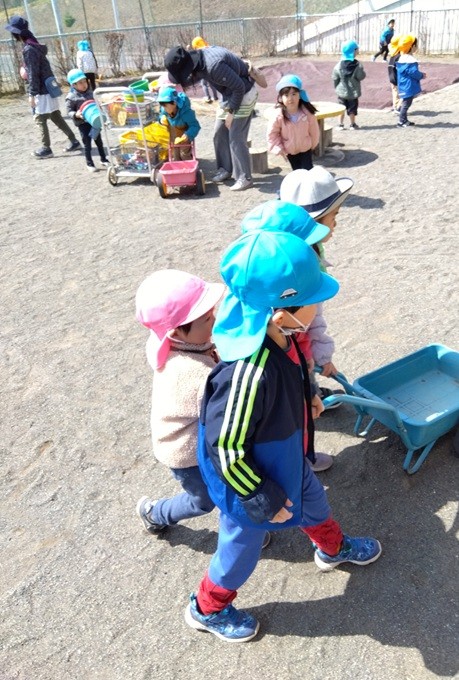 新入園児が来て、お兄さんお姉さんな姿を見せている年中組の子どもたち。片付けの場所がわからず困っている年少組を見つけ、皆で片付け場所まで連れて行ってあげていましたよ。